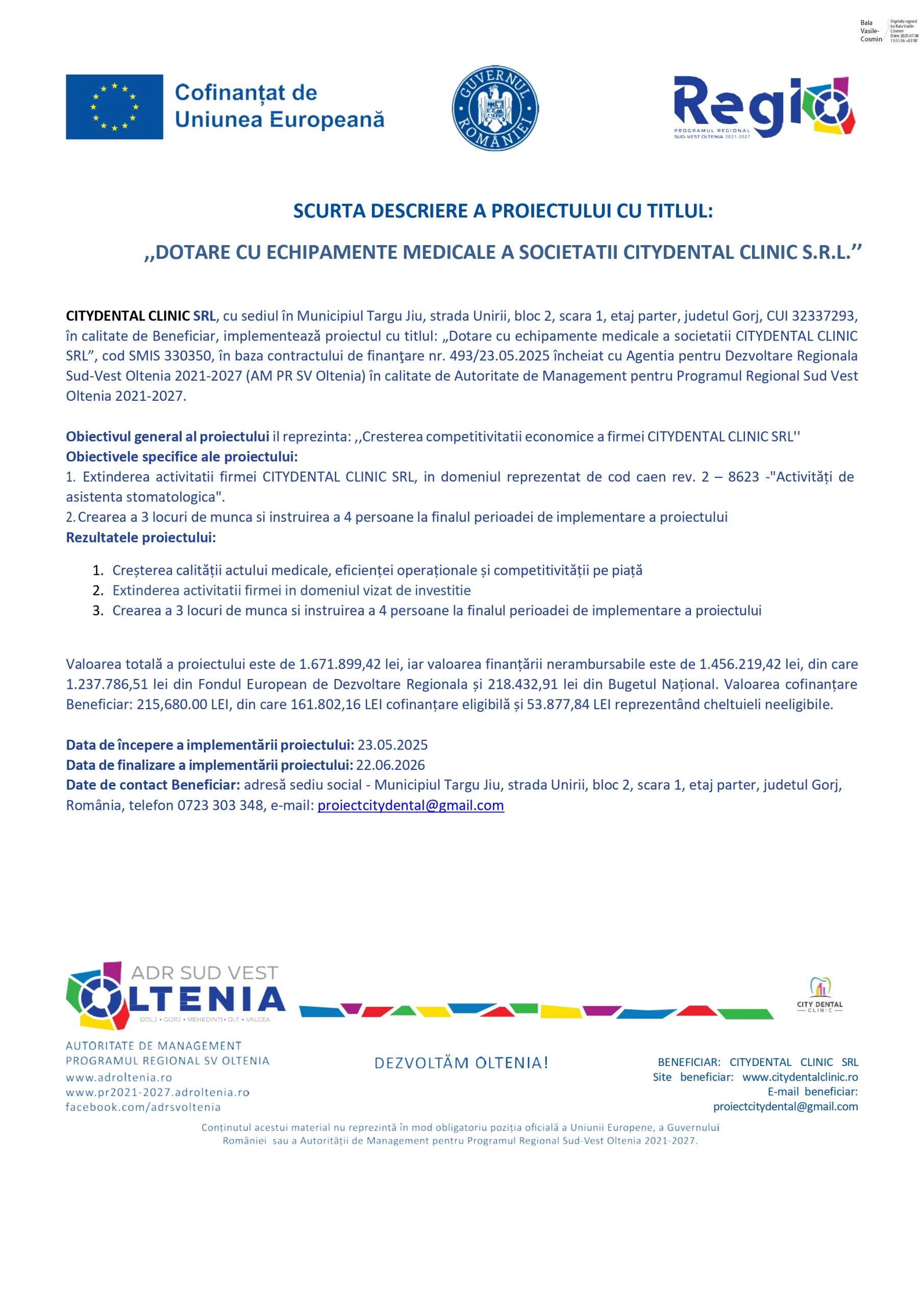 CITYDENTAL CLINIC SRL, cu sediul în Municipiul Targu Jiu, strada Unirii, bloc 2, scara 1, etaj parter, judetul Gorj, CUI 32337293, în calitate de Beneficiar, implementează proiectul cu titlul: „Dotare cu echipamente medicale a societatii CITYDENTAL CLINIC SRL”, cod SMIS 330350, în baza contractului de finanţare nr. 493/23.05.2025 încheiat cu Agentia pentru Dezvoltare Regionala Sud-Vest Oltenia 2021-2027 (AM PR SV Oltenia) în calitate de Autoritate de Management pentru Programul Regional Sud Vest Oltenia 2021-2027.